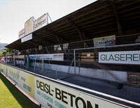 | Stadion Abgerocktes Ostblock Flair. Die alte Holztribüne liegt danieder wie die hiesige Blue-Collar-Arbeiterklasse. So gesehen liegt der Fett-Ami-Laberlkonzern diesmal gar nicht so falsch: „Reinbeissen Jungs“. ![]() |